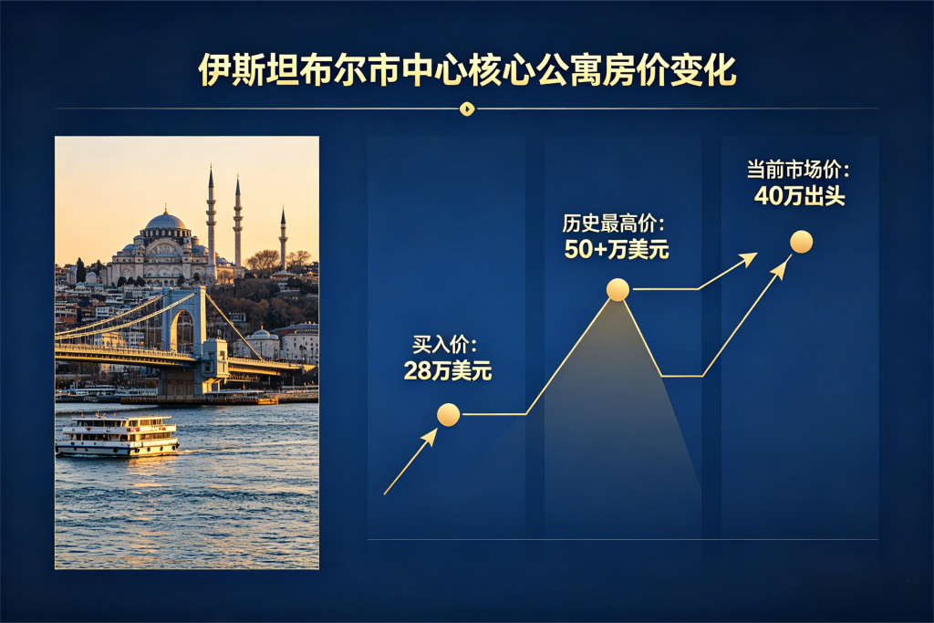 最后,跟大家分享一个我们团队的真实经历:我们现在就住在伊斯坦布尔市中心一套早期的核心公寓里,这套房当年一手买入价是28万美元,后来涨到过50多万美元,而现在查询的市场价,大概在40万出头。